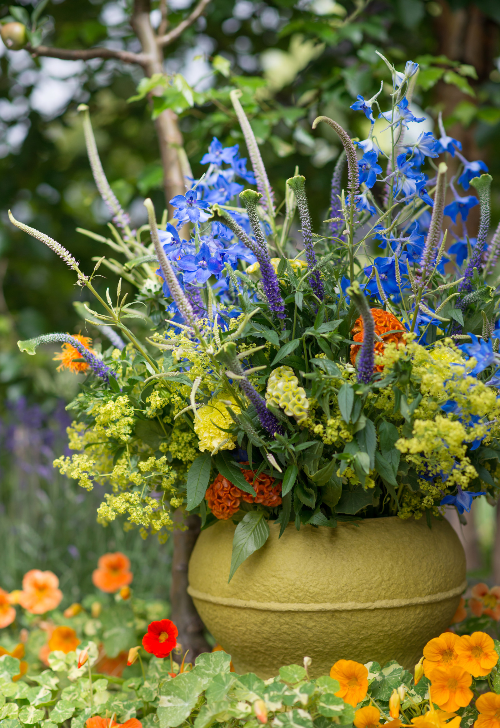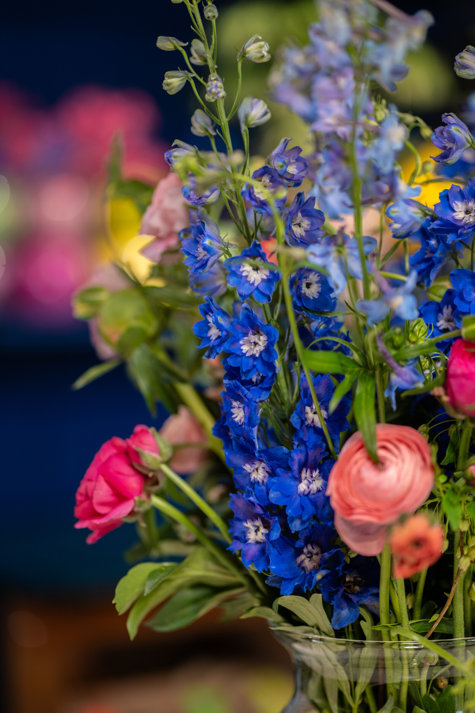 I delphinium hanno un colore intenso e profondo che contrasta con il verde degli steli e delle foglie. I colori vivaci rendono il Delphinium una scelta popolare per aggiungere accenti di colore in una composizione.